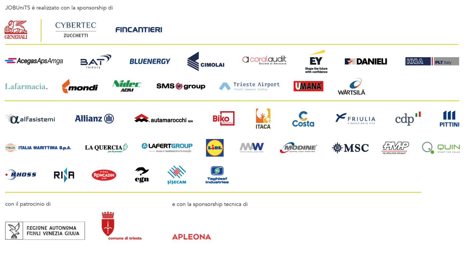 AcegasApsAmga – Gruppo HERA • Adecco • Alfa Sistemi S.p.A. • ALLIANZ • Apleona Italy S.p.A. • Area Science Park • autamarocchi • Autostrade Alto Adriatico S.p.A. • Banca Mediolanum • BAT Trieste • BCC VENEZIA GIULIA • Biko Meccanica • BLUENERGY • Carpe Diem • CHIOMENTI • Cimolai • Cooperativa Il Portico • Cooperativa Itaca • Coral Audit S.r.l. • COSTA CROCIERE S.p.A. • Crif S.p.A. • Cybertec • EUROPE DIRECT Trieste – Eurodesk – Informagiovani • EY • FINCANTIERI • FRIULIA • Generali • Gruppo CDP • Gruppo Danieli • Gruppo ICM S.p.A. • GRUPPO PITTINI • HHLA PLT Italy • Honeywell • IN SITU S.r.l. • Innova S.p.A. • ITALIA MARITTIMA S.p.A. • La Quercia Società Cooperativa sociale • Lafarmacia. • Lafert S.p.A. – Member of Sumitomo Heavy Industries • Lidl Italia • Manpower • MARCHESINI GROUP – Divisione SCHMUCKER • MAW • Modine • Mondi Duino • MSC Cruises • Nidec ACIM • PMP INDUSTRIES GROUP • PwC • QUIN S.r.l. • Randstad • Regione FVG i servizi per il lavoro e eures fvg • Rhoss S.p.A. • RINA • Roncadin S.p.A. SB • Segula Technologies • Servizi Cgn S.r.l. Società Benefit • Sisecam • SMS group S.p.A. • StarTech Trieste S.r.l. • Taghleef Industries S.p.A. • TRIESTE AIRPORT FRIULI VENEZIA GIULIA • Turin Tech • UMANA • UniCredit • Valmet • Volkswagen Group Italia • WALTER GROUP • Wärtsilä Italia
